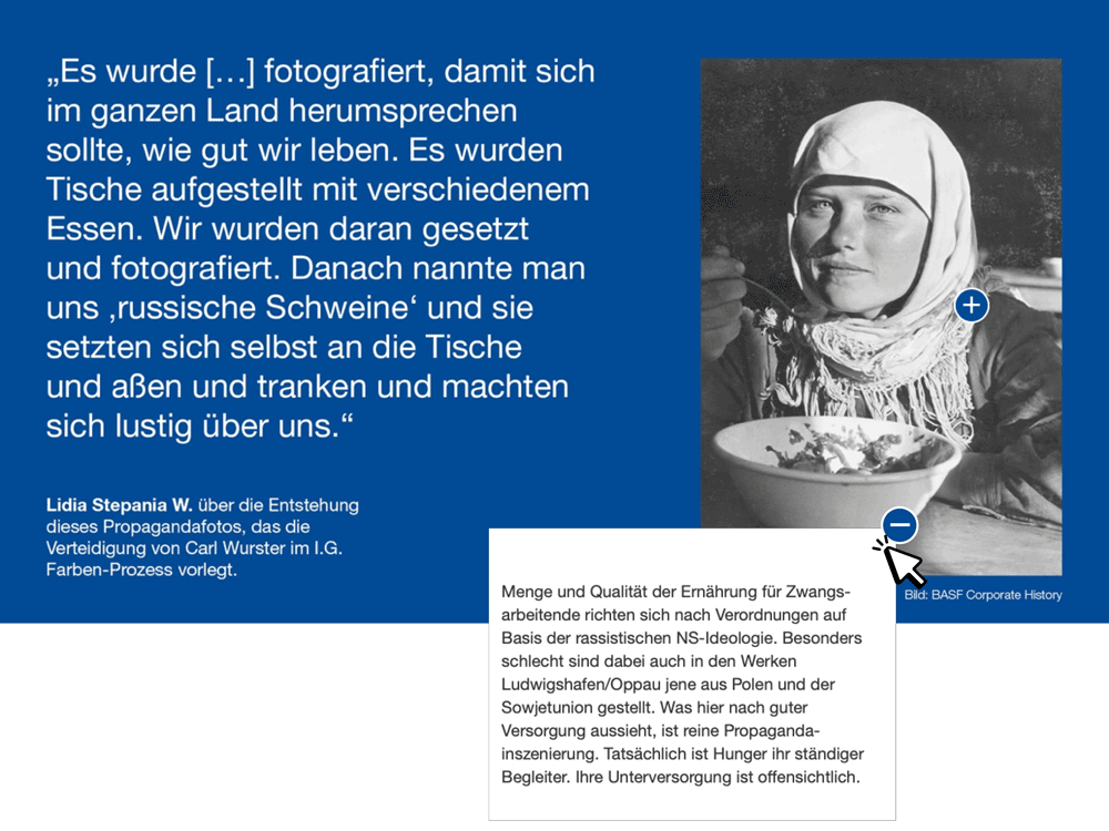 Vor diesem Hintergrund sind auch die Inhalte zu verstehen, die BASF Corporate History für das Webprojekt erarbeitete. Dabei galt es für die beiden Historikerinnen zunächst einmal Struktur in einen Wirrwarr aus unterschiedlichsten Themen, Aspekten, Quellen und Narrativen zu bringen. Aufgrund der archivischen Überlieferungslage konnten sie auf manche Fragen keine Antwort geben oder mussten vage bleiben. „Auch damit sind wir aber transparent umgegangen“, so Dr. Susan Becker. Die Mythen und Narrative wurden offen thematisiert und hinterfragt: „Dabei ging es uns nicht nur um die Überprüfung ihres Wahrheitsgehalts mithilfe historischer Quellen, sondern auch darum, ihren Entstehungskontext zu ergründen.“